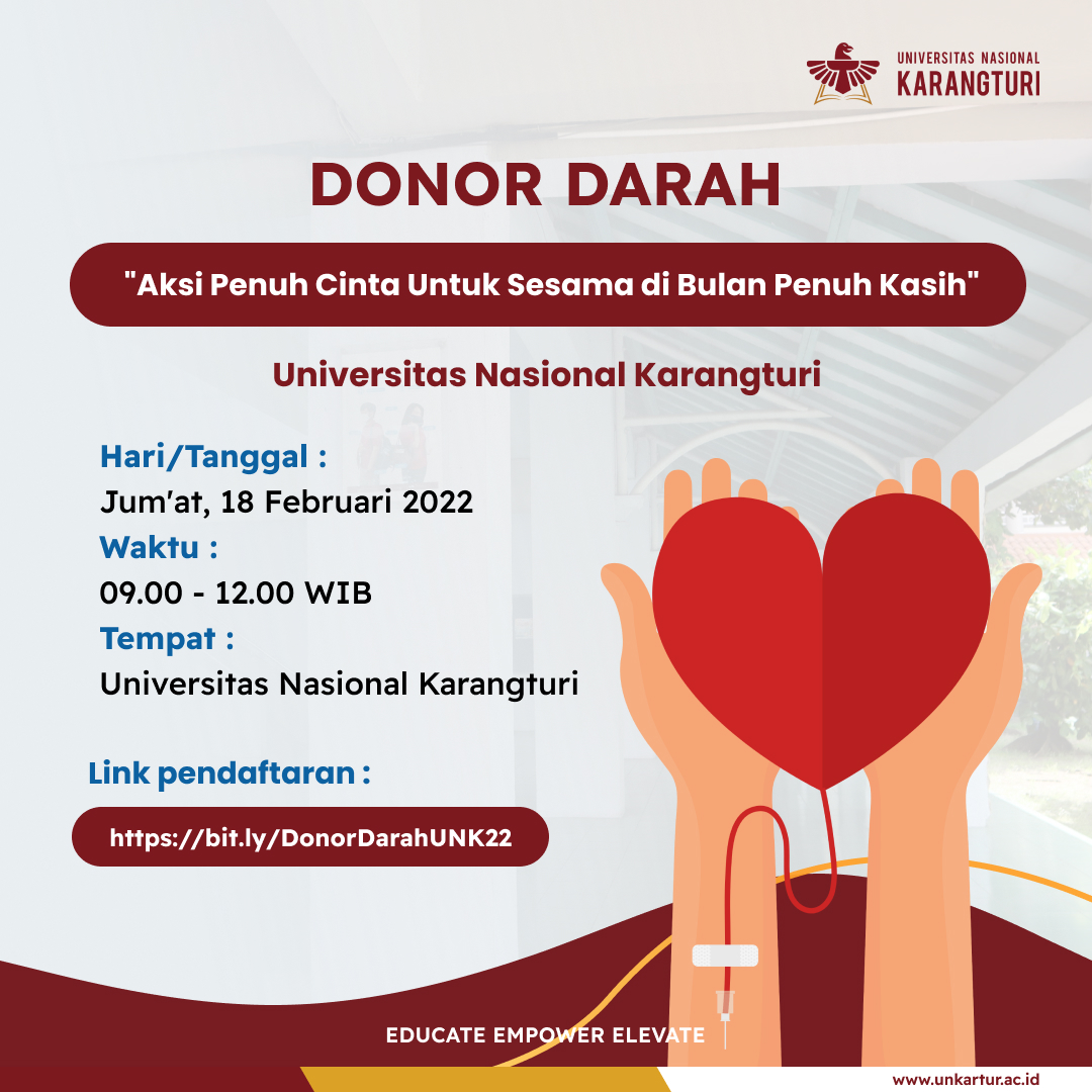 Universitas Nasional Karangturi bekerja sama dengan UDD PMI kota Semarang yang akan menyelenggarakan donor darah massal di bulan Februari ini guna memperingati bulan penuh kasih sayang pada : Hari/Tanggal : Jum’at, 18 Februari 2022 Waktu : 09.00 – 12.00 WIB Tempat : Universitas Nasional Karangturi Link Pendaftaran Yuk segera daftarkan diri anda untuk memberikan bukti cinta...Read More