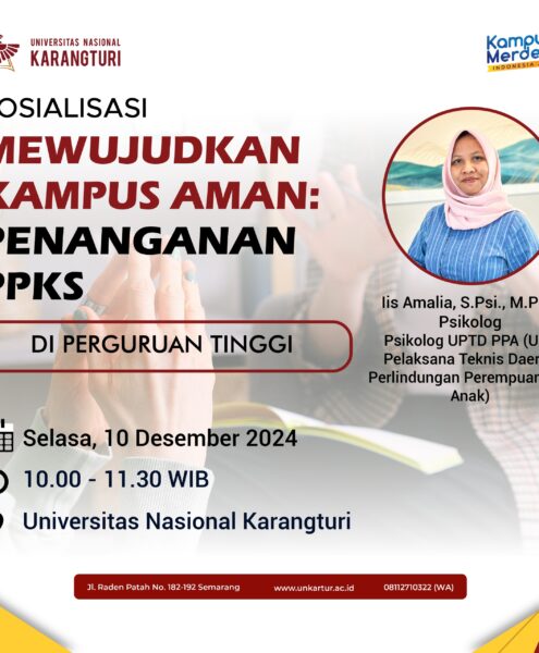Semarang, 3 Desember 2024 – Universitas Nasional Karangturi (UNKARTUR) Semarang akan menggelar sosialisasi dengan tema “Mewujudkan Kampus Aman“ pada 10 Desember 2024 mendatang. Sosialisasi ini mengangkat topik “Penanganan dan Pencegahan...