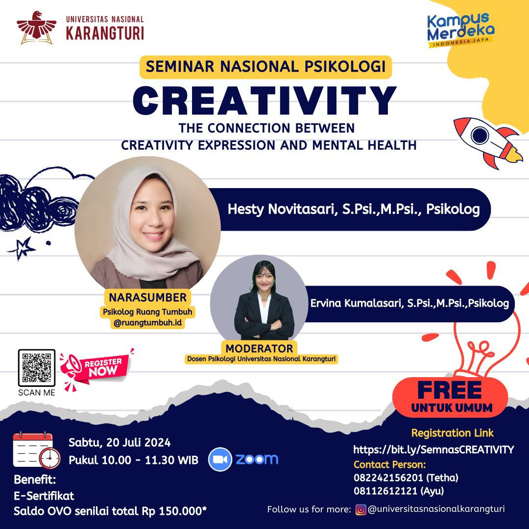 🔊Psikologi Universitas Nasional Karangturi Semarang Proudly Present 📢 WEBINAR NASIONAL PSIKOLOGI GRATISS…!!!📢 Creativity (The Connection Between Creativity Expression And Mental Health) Waktu Pelaksanaan📅Sabtu, 20 Juli 2024⏰ 10.00-11.30 WIB📍Live on Zoom Meeting 🏹 Terbuka Untuk Umum💸 Gratis BenefitIlmu yang bermanfaatE-sertifikatSaldo Ovo total 150.000 link pendaftaranhttps://bit.ly/SemnasCREATIVITY Join Zoom Meetinghttps://us02web.zoom.us/j/82771765829?pwd=rddgGJfEarrzZaWM248PjiBchyn1xD.1 Meeting ID: 827 7176 5829Passcode: 374666 Contact Person☎️...Read More