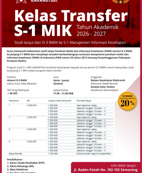 Program studi S-1 MIK UNKARTUR membuka kesempatan kepada semua alumni D-3 RMIK untuk melanjutkan studi ke jenjang S-1 MIKProgram studi S-1 MIK UNKARTUR membuka kesempatan kepada semua alumni D-3 RMIK untuk melanjutkan studi ke jenjang S-1 MIK melalui program kelas transfer. melalui program kelas transfer.